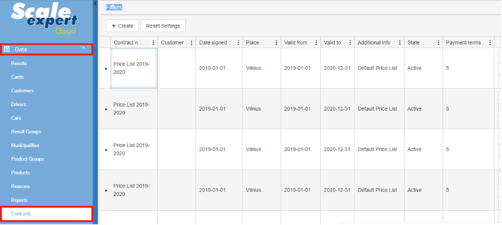 Expand the "Data" list in the menu, to select the “Contracts”.
