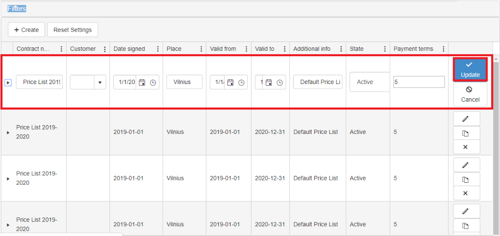 After filtering You get all data of contracts with customer “Omnitex”, which are finished.
