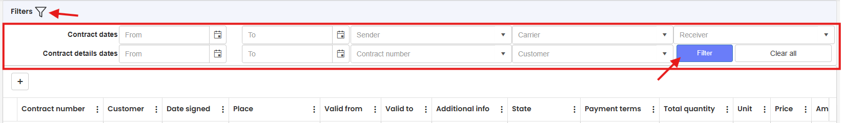 For single filtering press the button with three dots near a column name. Single filtering allows to find result about one column. Example: Filtering the contracts by the customer "Omnitex".