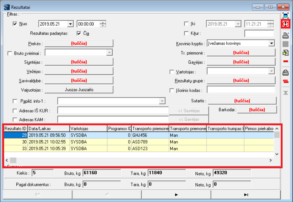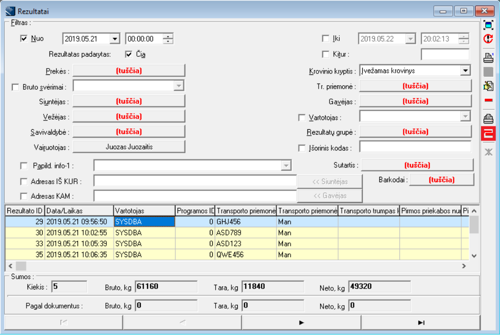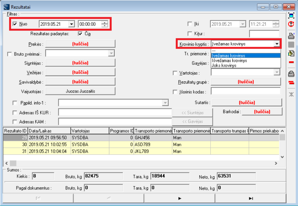 Įsivaizduokime, kad reikia surasti visus įrašus ir pateikti ataskaitą apie visus vairuotojo Juozo Juozaičio įvežtus krovinius nuo 2019 metų gegužės mėnesio 21 dienos.