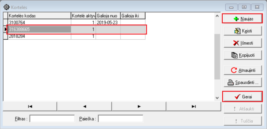 Norėdami sukurti naują kortelę,  spaudžiame mygtuką „Naujas“. Užpildę duomenis spaudžiame mygtuką „Gerai“.