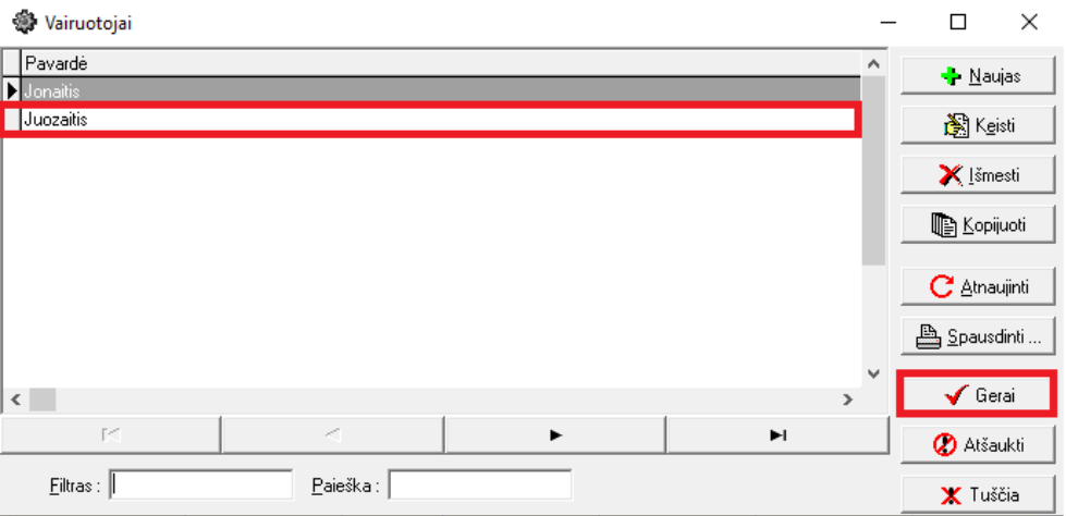 Iš esamų vairuotojų sąrašo, pagal pavardę pasirenkame Juozaitis“.